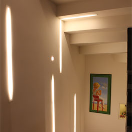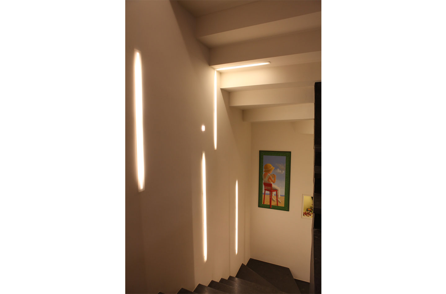 To light the space, the lighting was integrated in already existing architectural features such as the projectors on the i-beams and the horizontal profiles coming out of the vertical structures.