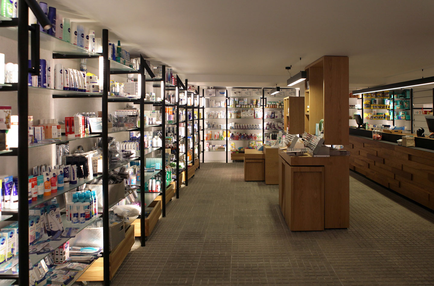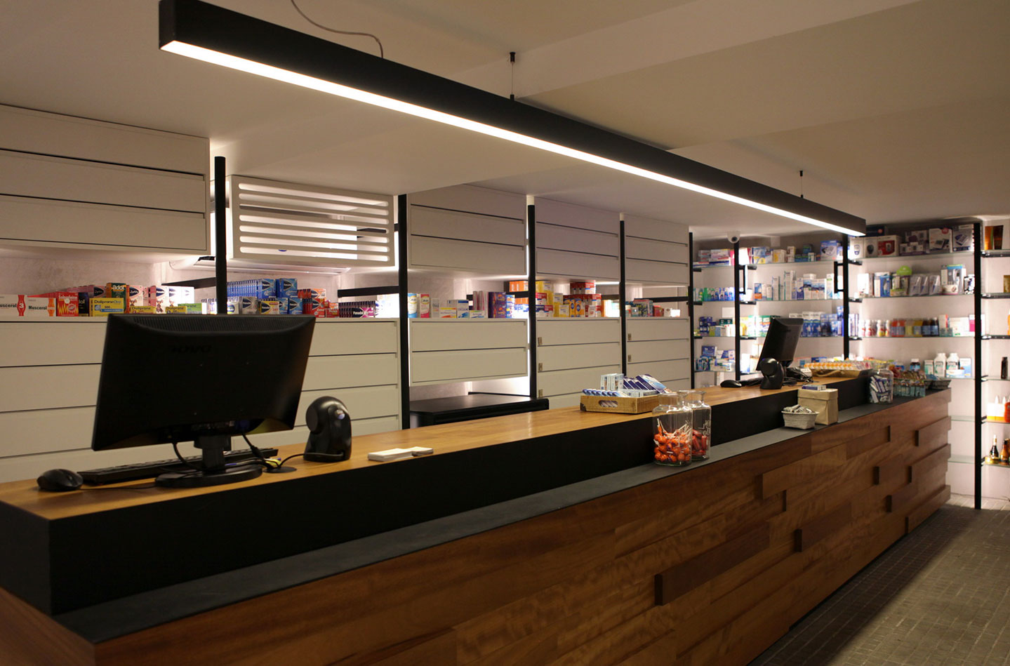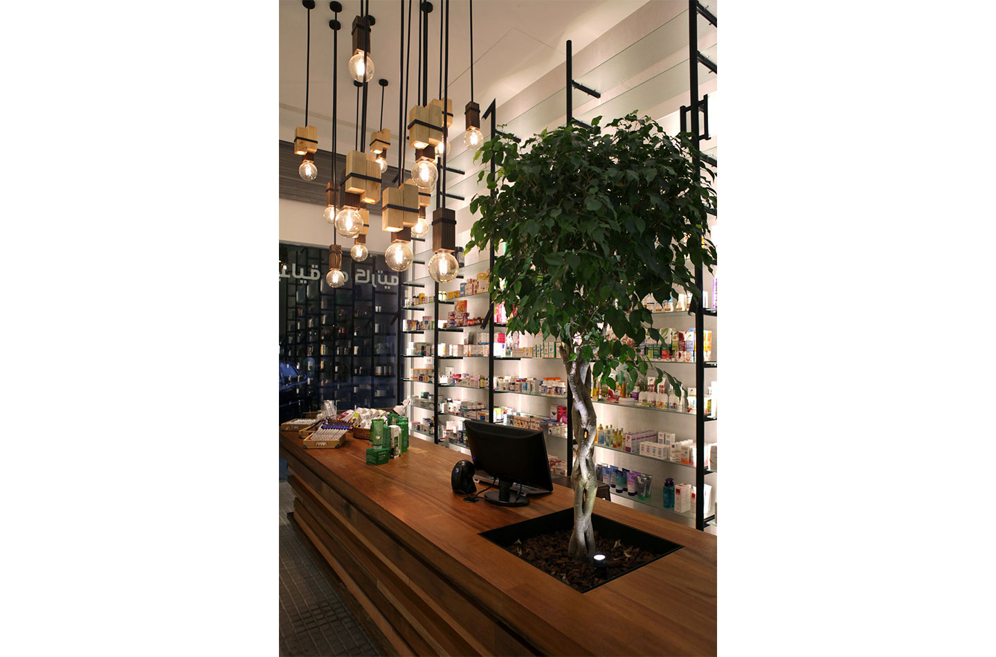 The lighting of this pharmacy is inspired by the natural materials used in the space.